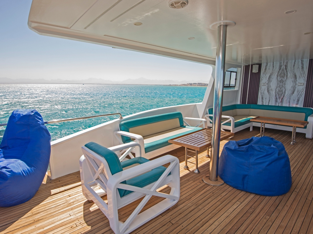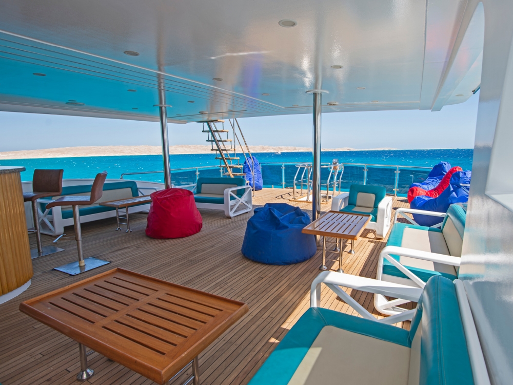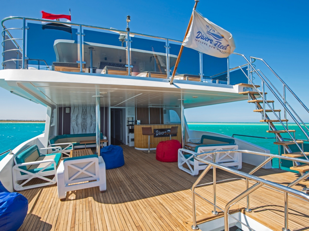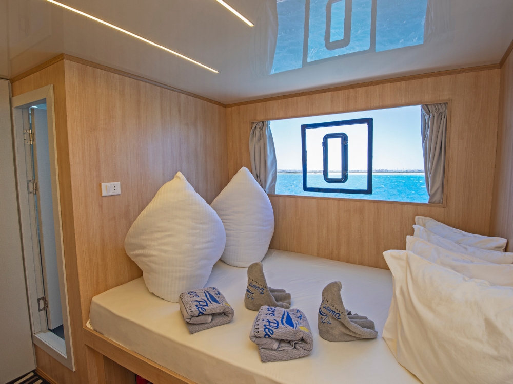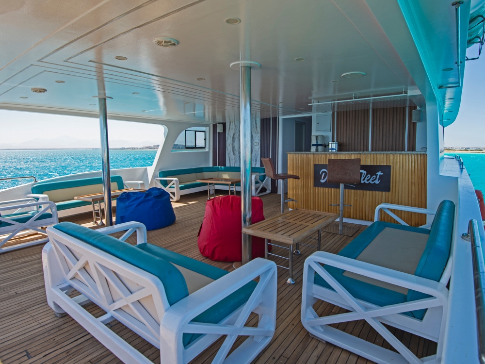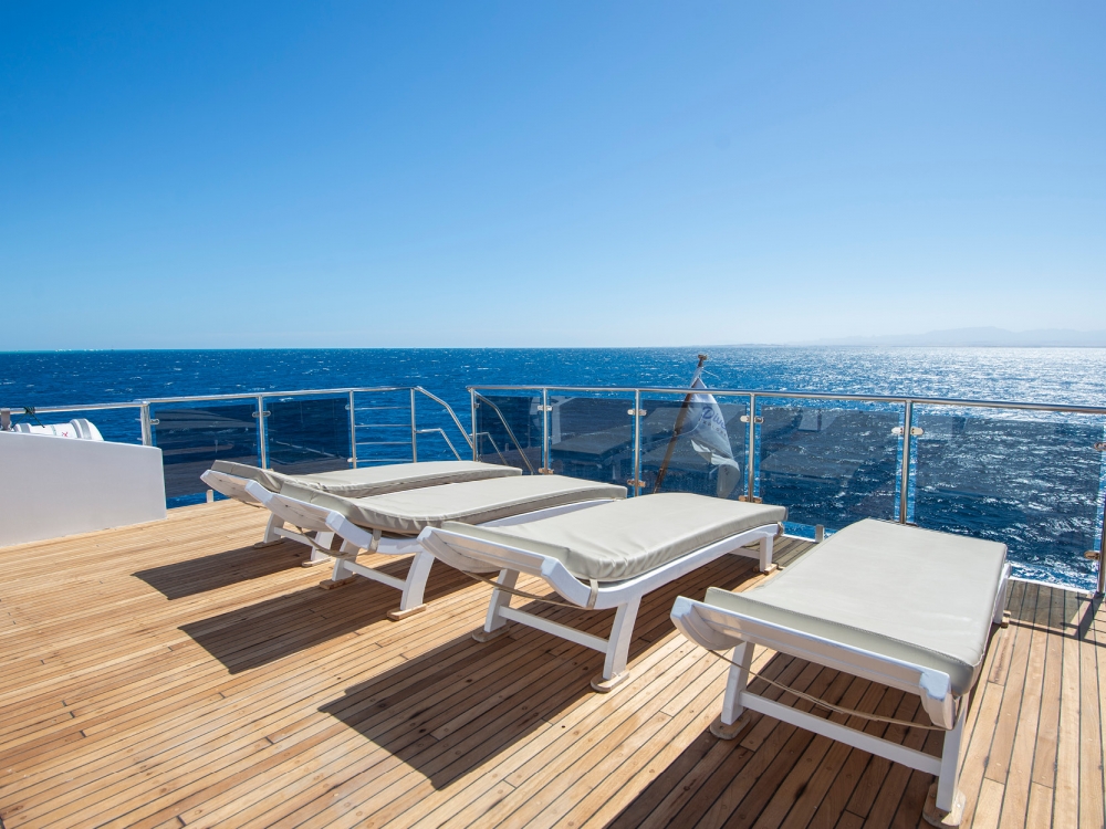 The bright and welcoming common areas include an indoor lounge-restaurant and a bar where you can share your diving stories in a relaxed atmosphere. On the upper deck, an open-air lounge bar and a large sun deck invite you to relax and contemplate between dives in the turquoise waters of the Red Sea. Designed with divers in mind, the spacious dive deck makes it easy to launch and rinse equipment. The boat is equipped with a free Nitrox system for certified divers and has dedicated areas for photo and video equipment.