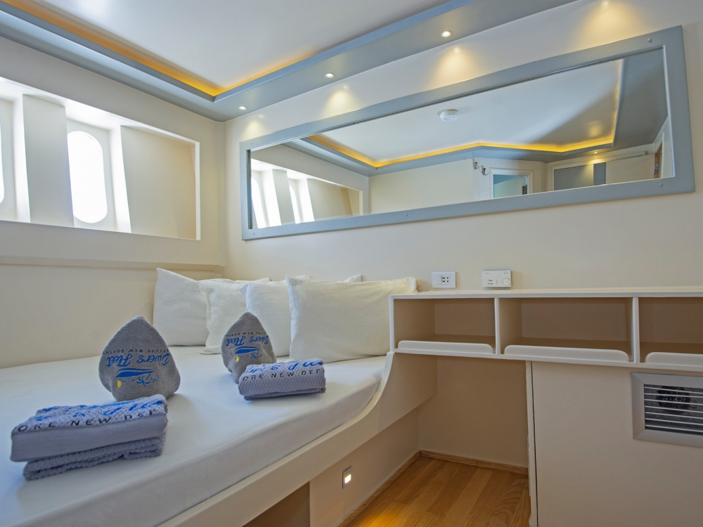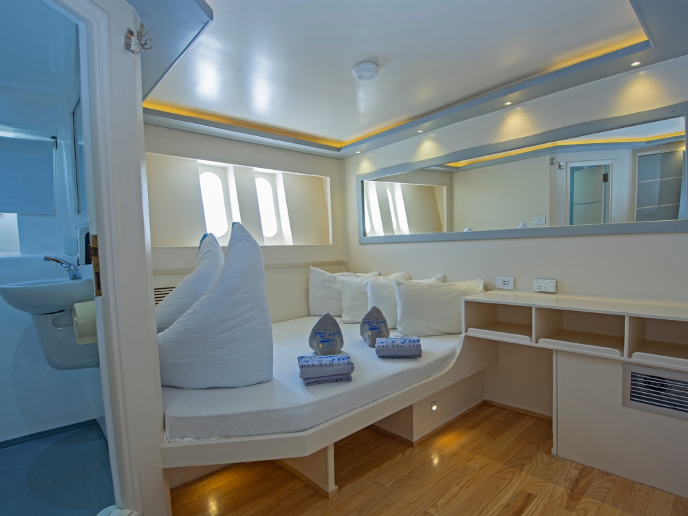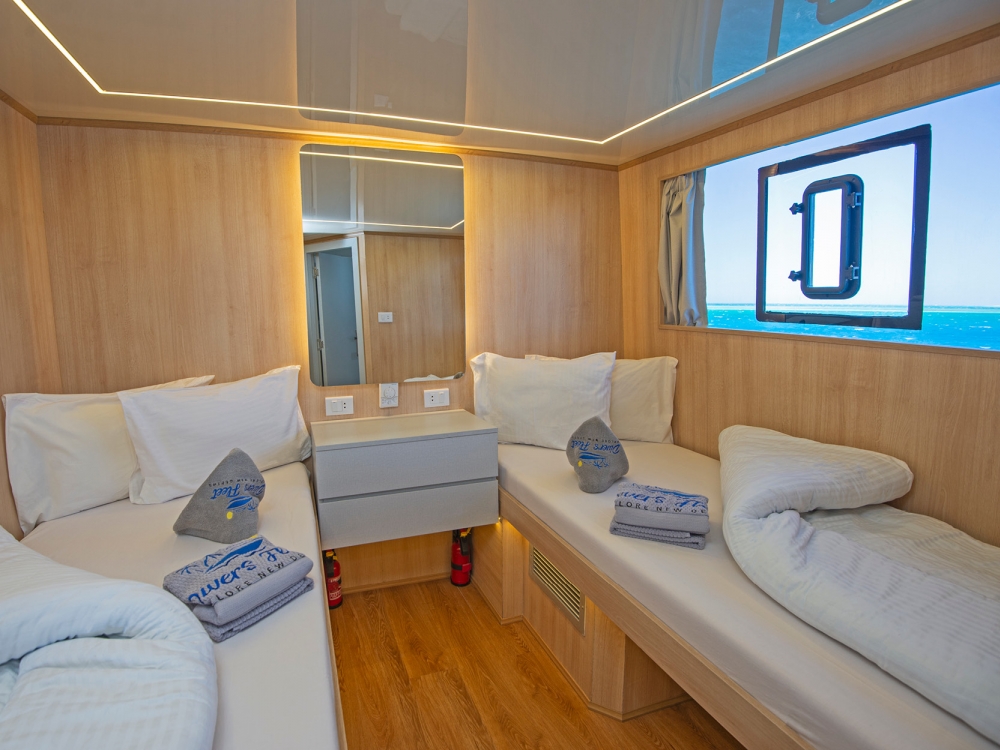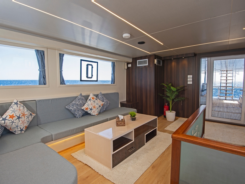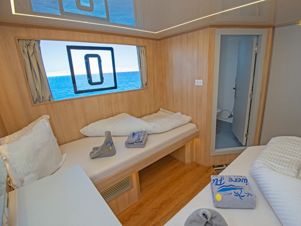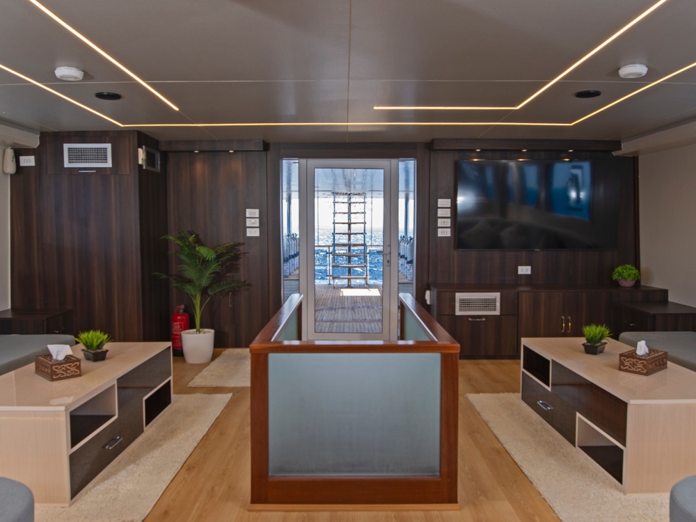The bright and welcoming common areas include an indoor lounge-restaurant and a bar where you can share your diving stories in a relaxed atmosphere. On the upper deck, an open-air lounge bar and a large sun deck invite you to relax and contemplate between dives in the turquoise waters of the Red Sea. Designed with divers in mind, the spacious dive deck makes it easy to launch and rinse equipment. The boat is equipped with a free Nitrox system for certified divers and has dedicated areas for photo and video equipment.