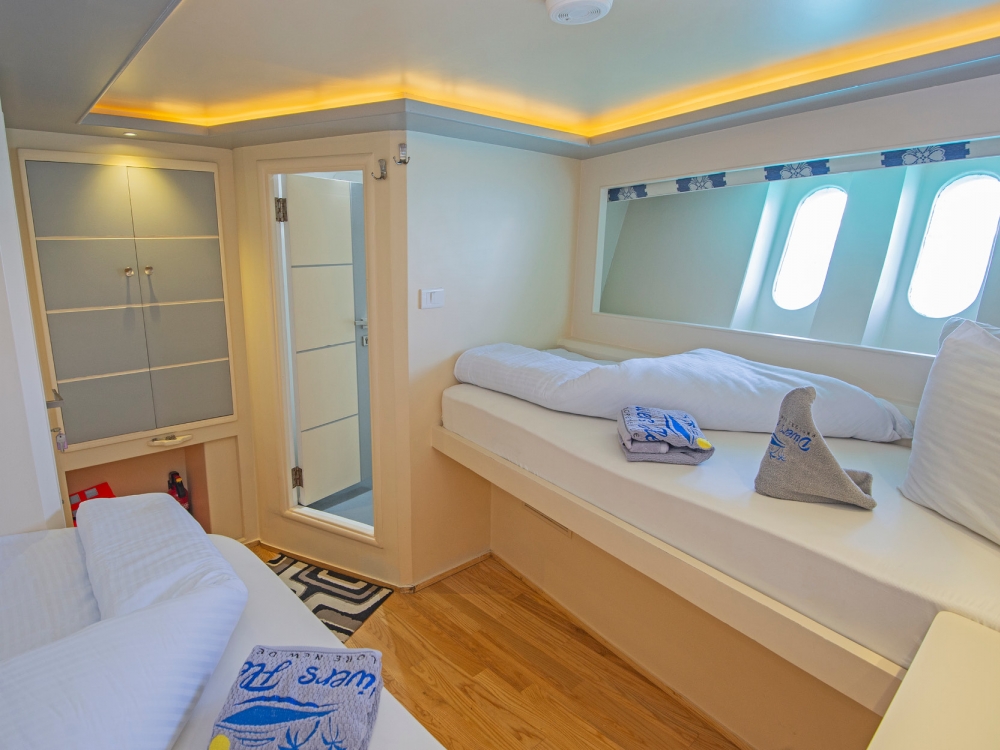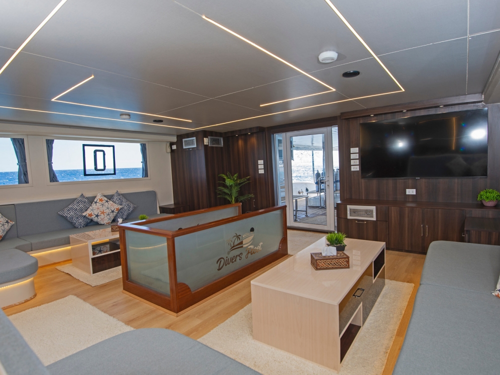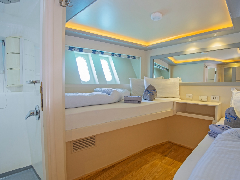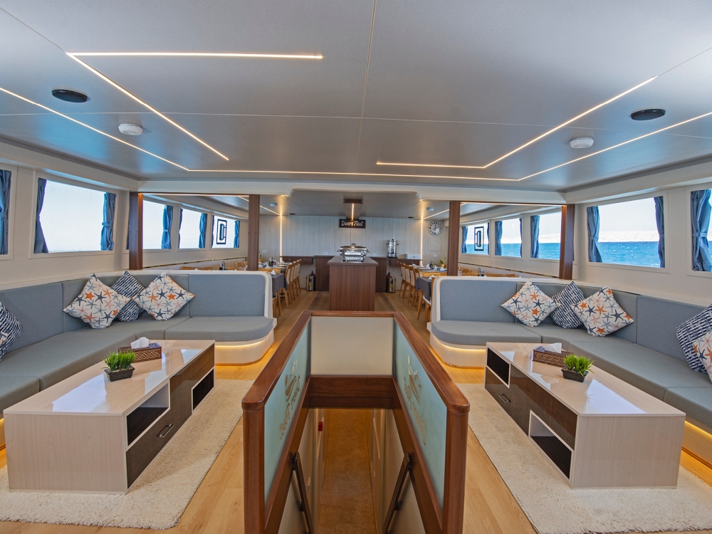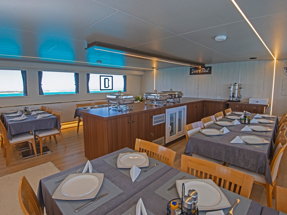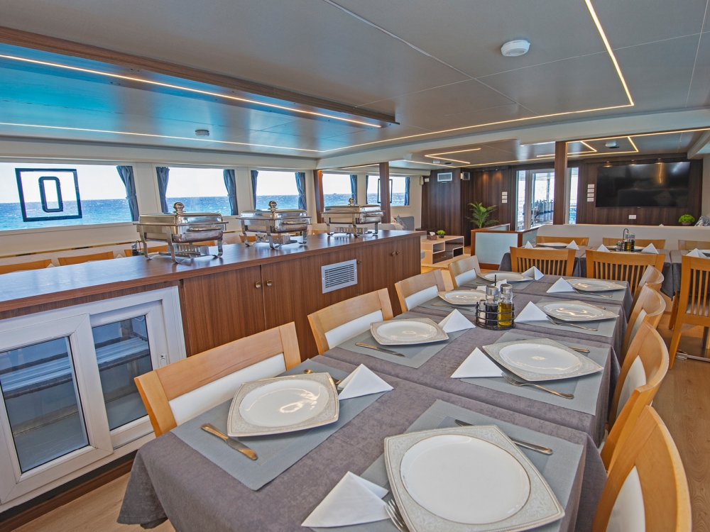 The bright and welcoming common areas include an indoor lounge-restaurant and a bar where you can share your diving stories in a relaxed atmosphere. On the upper deck, an open-air lounge bar and a large sun deck invite you to relax and contemplate between dives in the turquoise waters of the Red Sea. Designed with divers in mind, the spacious dive deck makes it easy to launch and rinse equipment. The boat is equipped with a free Nitrox system for certified divers and has dedicated areas for photo and video equipment.