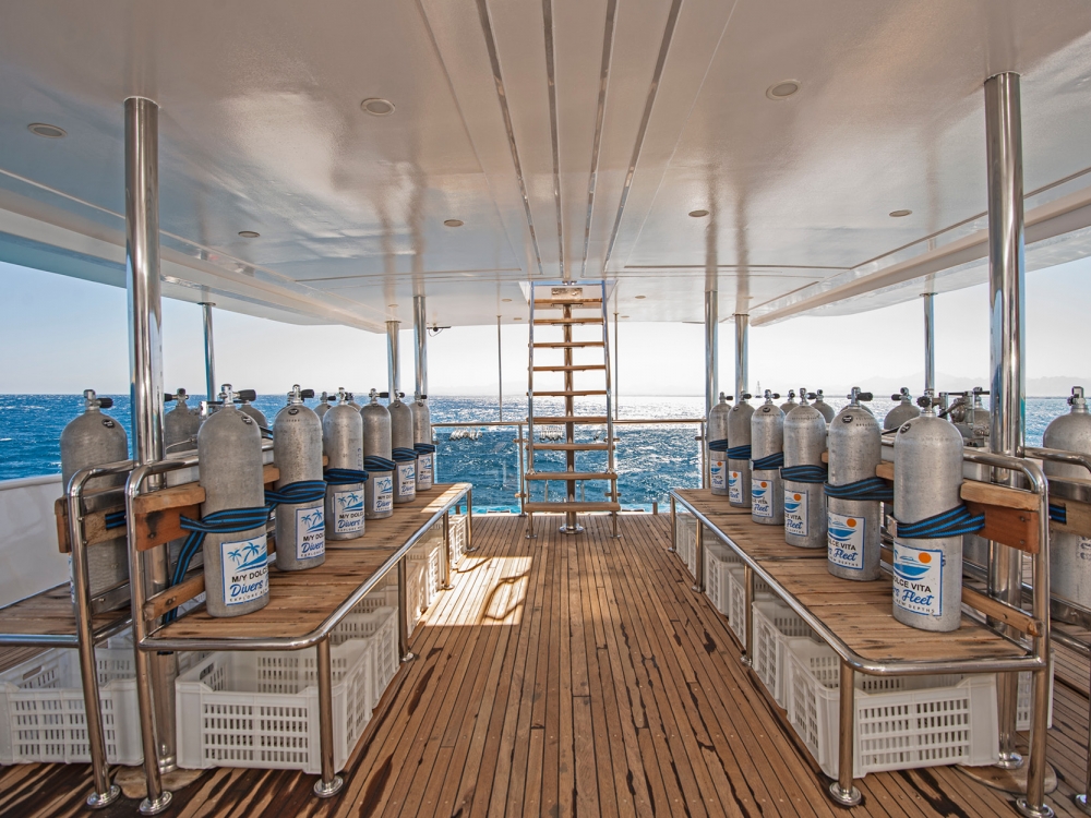 The Dolce Vita is an elegant, modern and refined 38-metre boat that sails all year round to the most beautiful sites in the Red Sea. It accommodates up to 24 divers in 12 comfortable cabins, all equipped with private bathrooms, individual air conditioning and generous storage space.