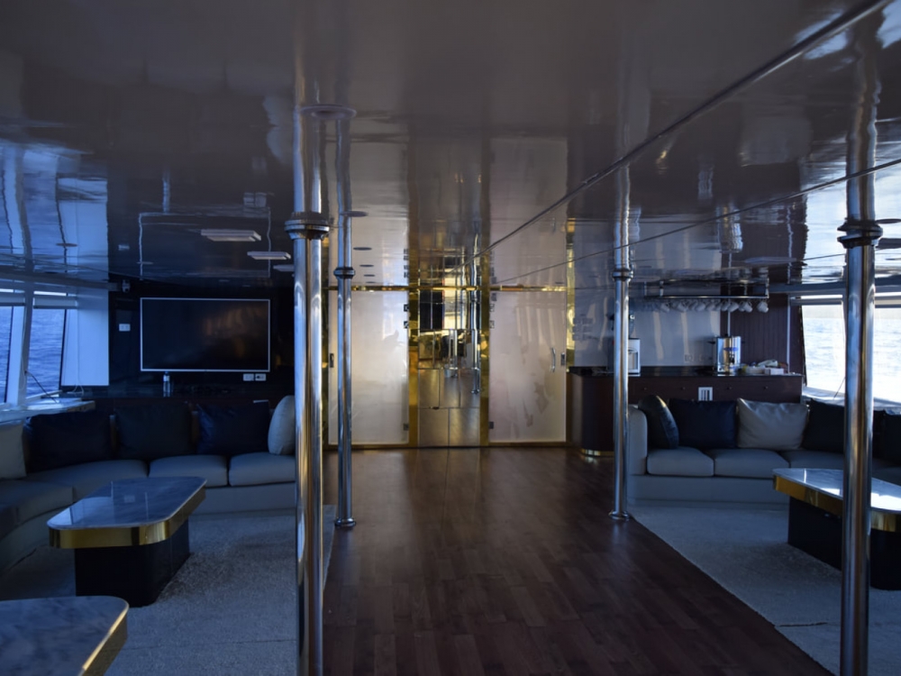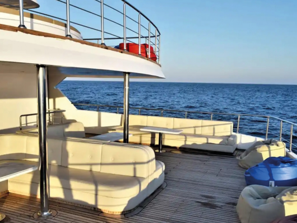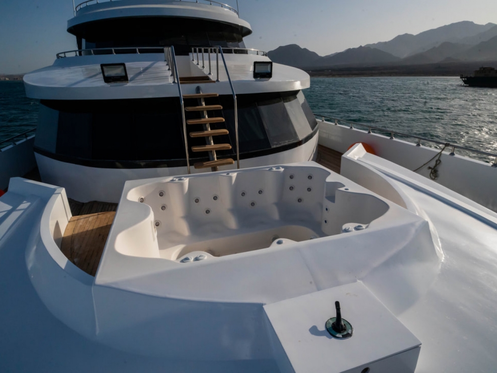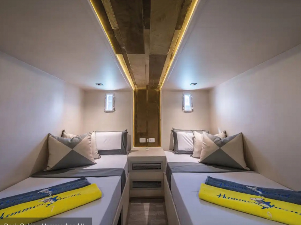 The Hammerhead II is a superb 43-metre vessel, combining modern elegance, comfort and functionality to offer an unforgettable diving cruise experience in the Red Sea. It has 16 air-conditioned cabins, some with private bathrooms, accommodating up to 32 passengers in a refined and friendly setting. The common areas have been designed for relaxation: a bright lounge-restaurant with large panoramic windows allows you to enjoy your meals while admiring the scenery, while the upper decks offer spacious solariums, a jacuzzi and a mini-bar for relaxing after your dives.