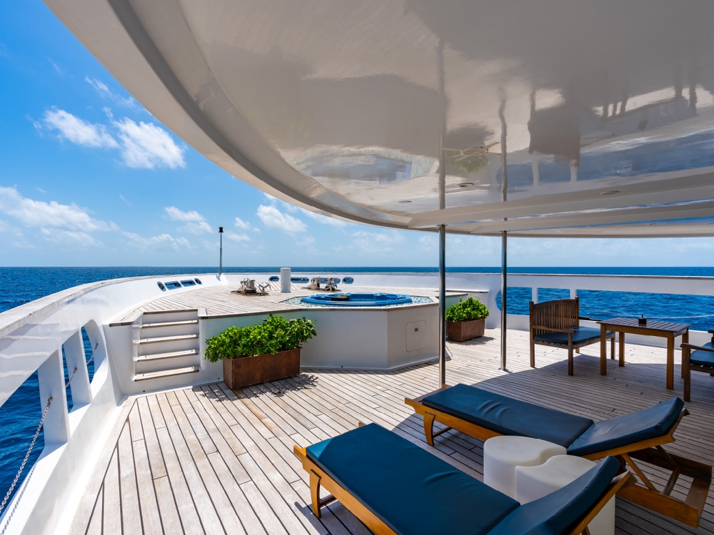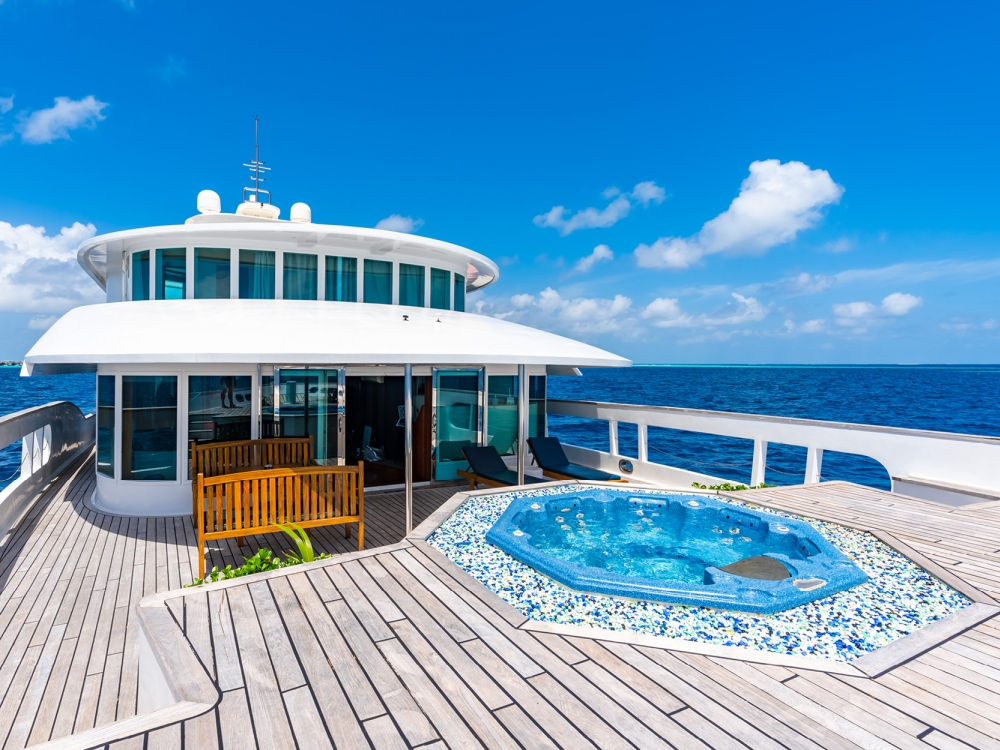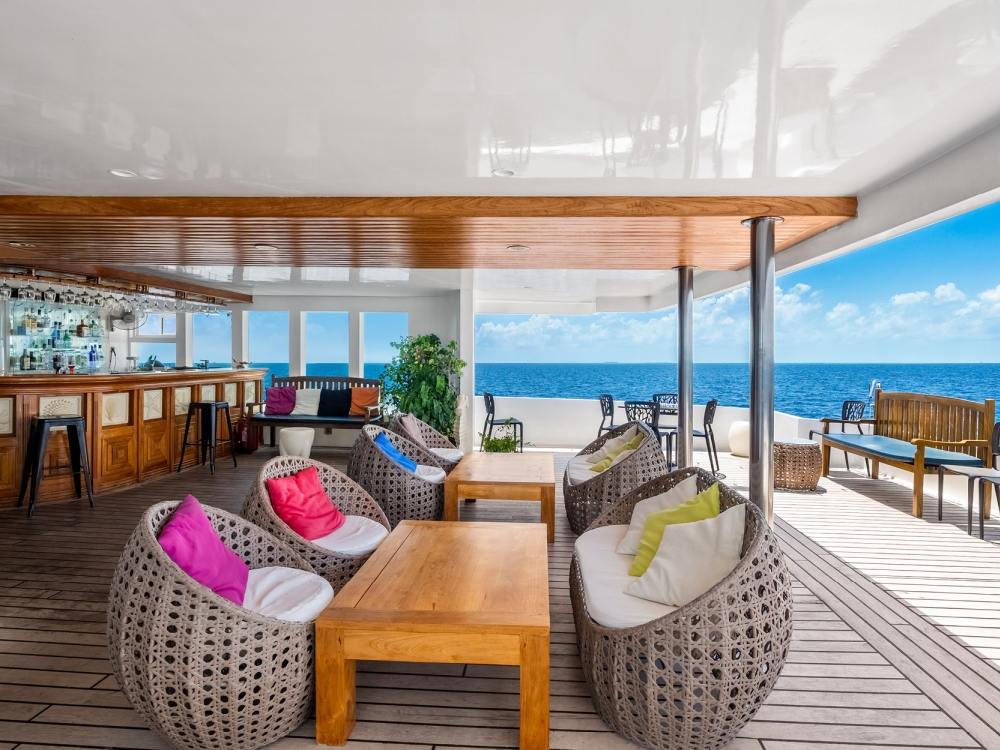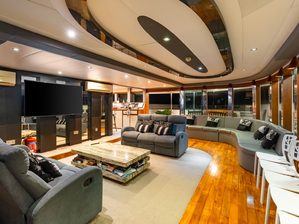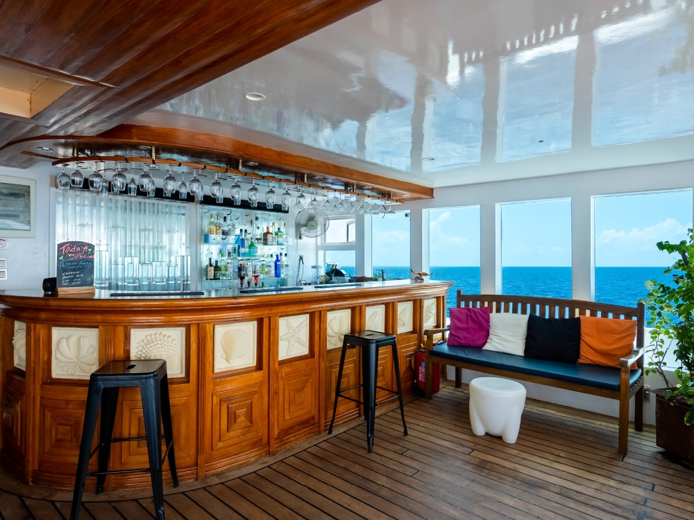The common areas are designed for relaxation and conviviality. The bright indoor lounge features a large TV screen, perfect for watching your underwater footage or enjoying a movie in the evening, while the outdoor lounge and baroffer stunning views and a peaceful atmosphere to unwind with a drink. For sun lovers, spacious sun decks are available to fully enjoy the warm Maldivian breeze.