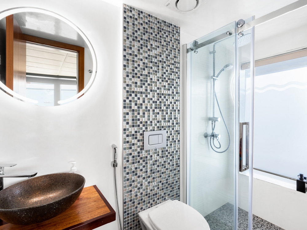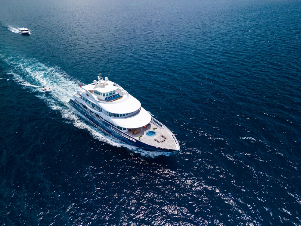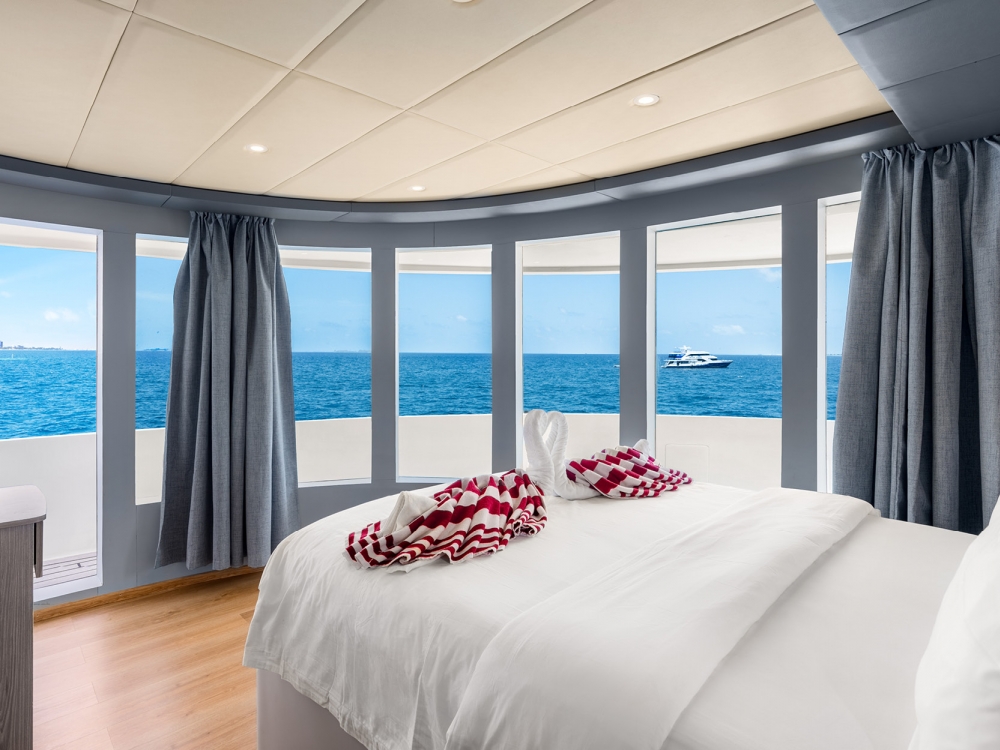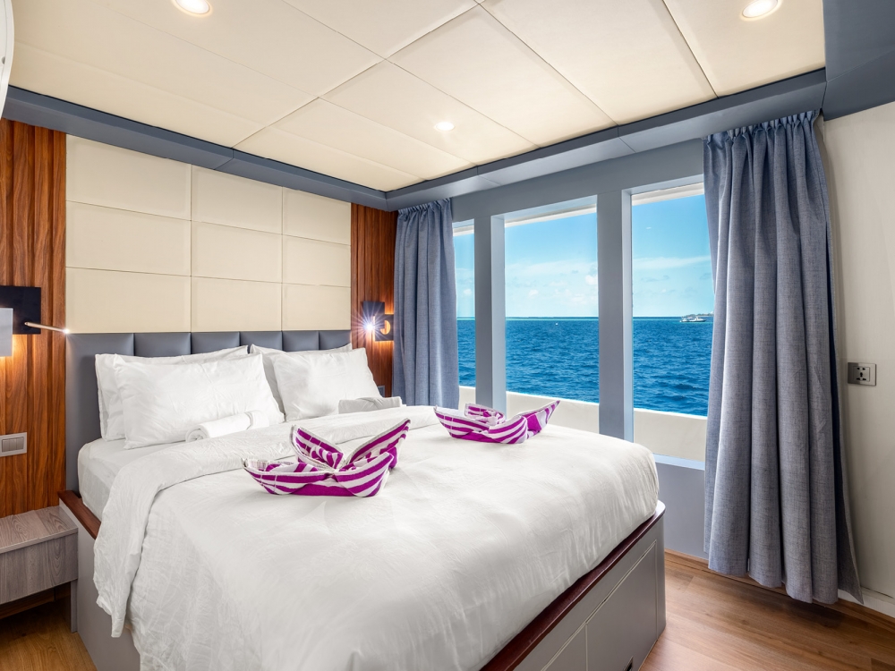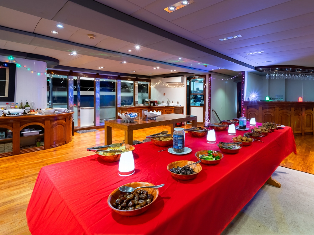 The common areas are designed for relaxation and conviviality. The bright indoor lounge features a large TV screen, perfect for watching your underwater footage or enjoying a movie in the evening, while the outdoor lounge and baroffer stunning views and a peaceful atmosphere to unwind with a drink. For sun lovers, spacious sun decks are available to fully enjoy the warm Maldivian breeze.